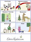 Each postcard includes six whimsical drawings depicting alternatives to the use of animals in clothing, entertainment, product testing, research, education and food. The back of the Any Occasion postcard is blank. The back of the Holiday postcard is mostly blank but contains the following message in small letters at the bottom of the card: There are simple ways we can bring more kindness into the world. The postcard is 4 1/4 ” x 5 1/2 ” and fits into a standard A2 envelope (4 3/8” x 5 3/4 ”). Note that if you plan to include enclosures, you may need a larger envelope. A2 and other envelopes are not available through this website but may be purchased at most office supply stores and copy centers.